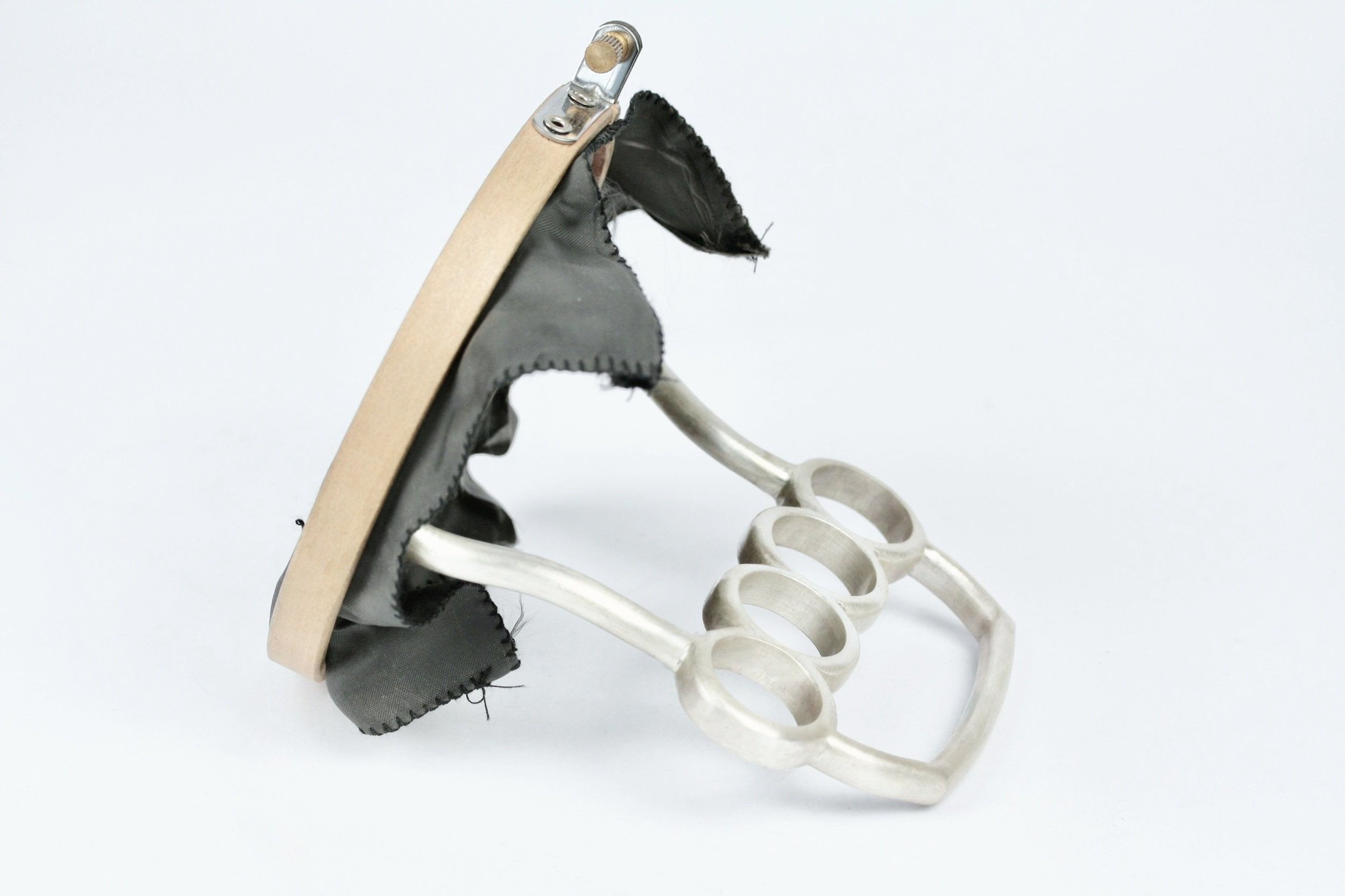 silver, embroidery hoop, school skirt lining, thread. mountjoy is the name of a men’s prison in ireland.This piece has been included in two exhibitions with ‘‘precious collective’’, taking part in both Munich jewellery week 2024 and the Cagnes-sur-mer festival in France.